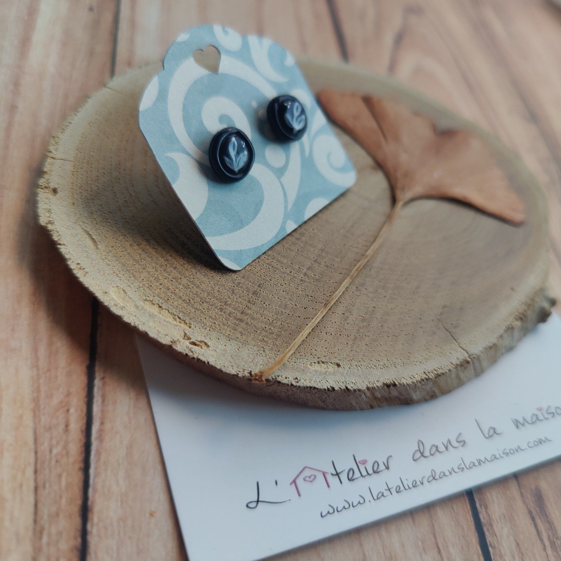 Ces puces d'oreilles clips faciles à mettre sont noires et rondes et décorées d'une feuille blanche dessinée par mes soins.