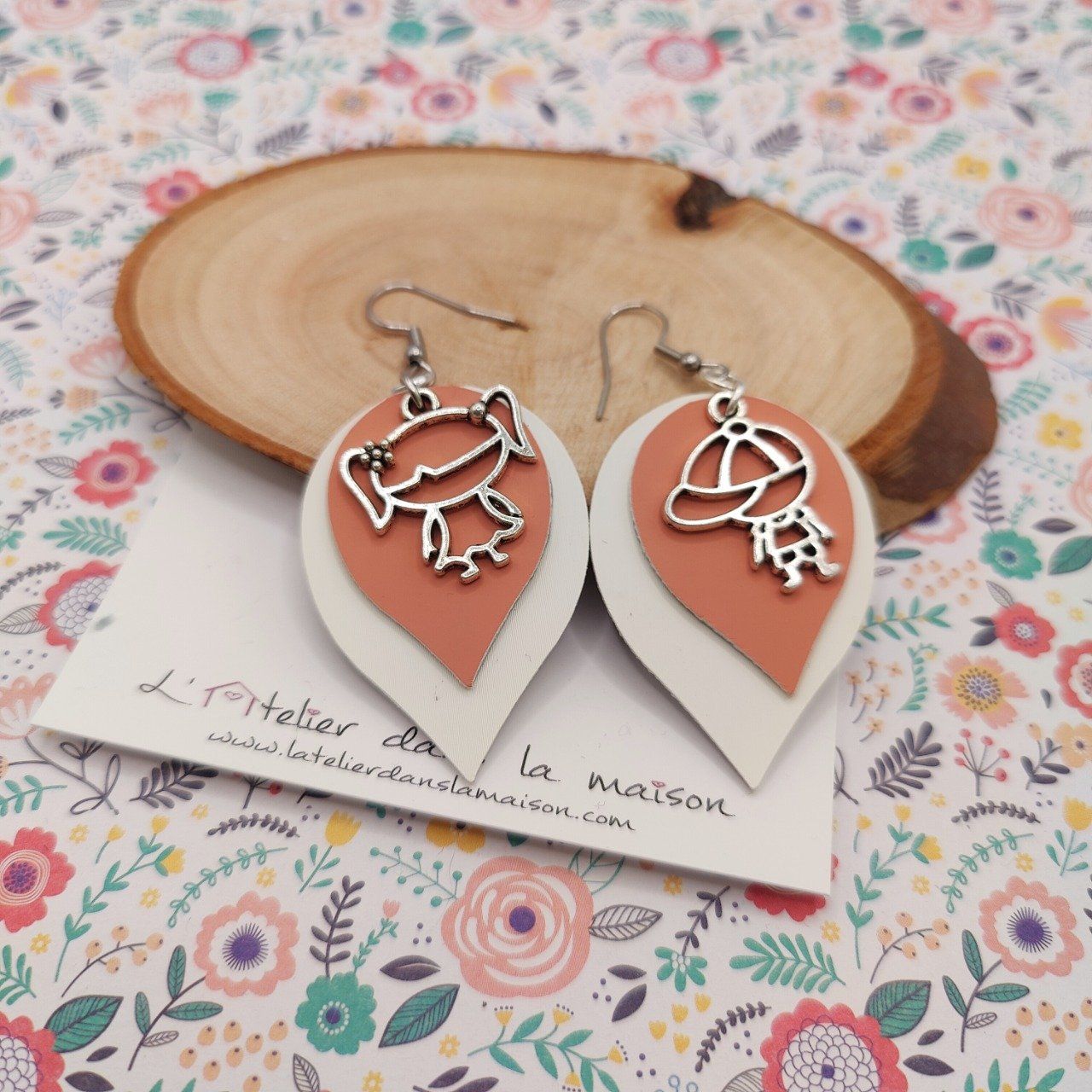 Des boucles d'oreilles aux tons corail et blanc pour un ensemble chic et délicat avec une touche d'originalité avec leur jolie breloque garçon et fille !