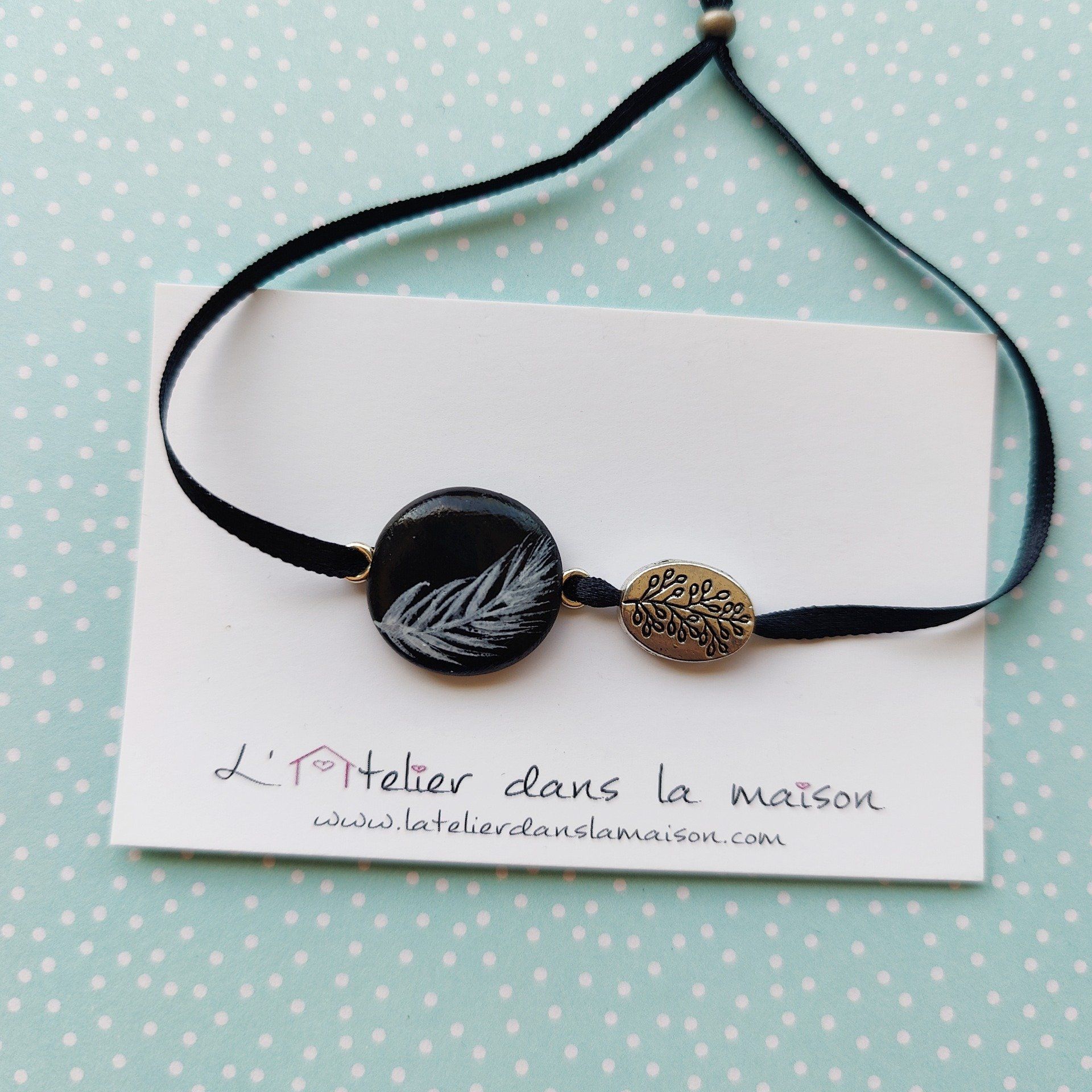 Un joli bracelet raffiné en noir et blanc avec sa plume peinte à la main, créé avec soin par l'atelier dans la maison.