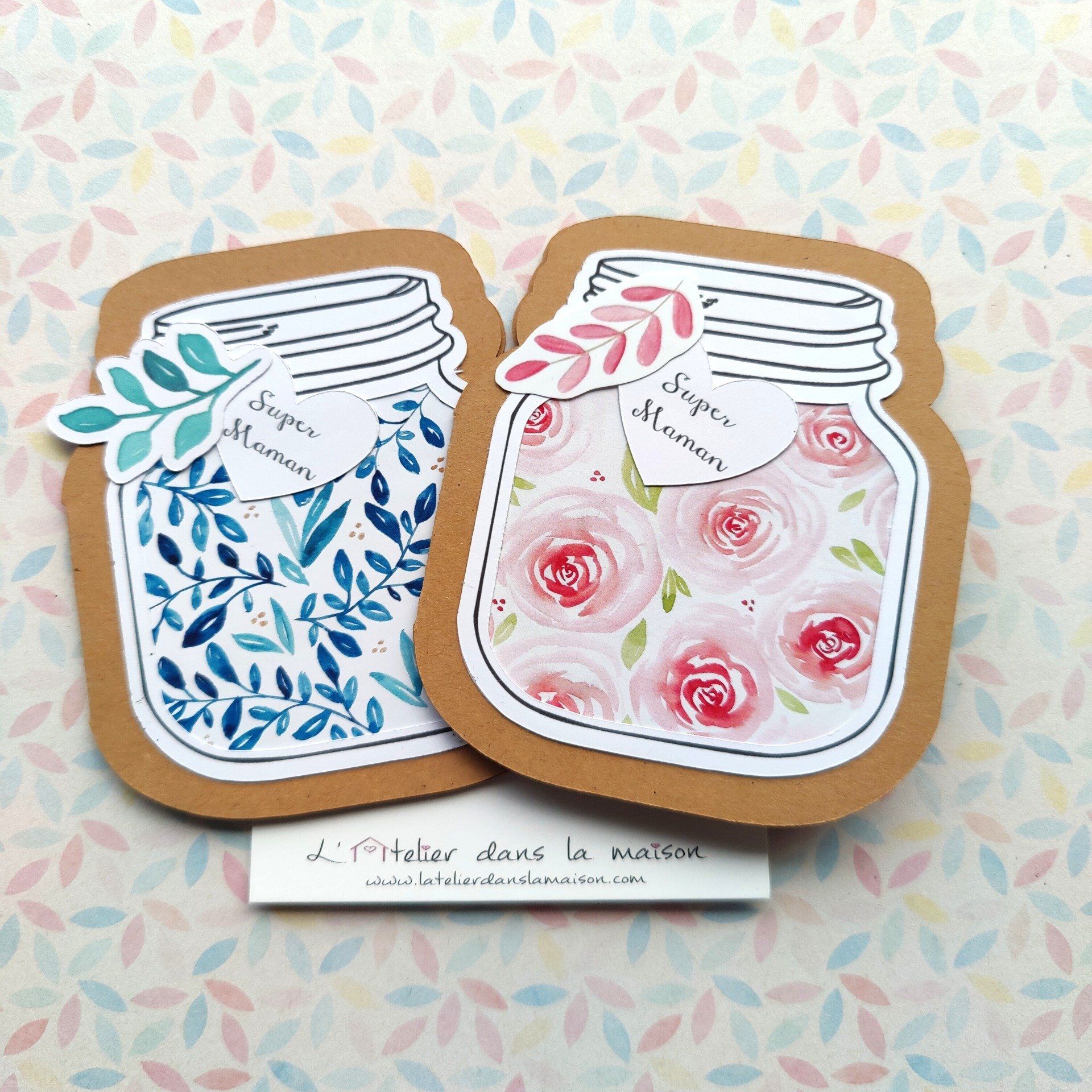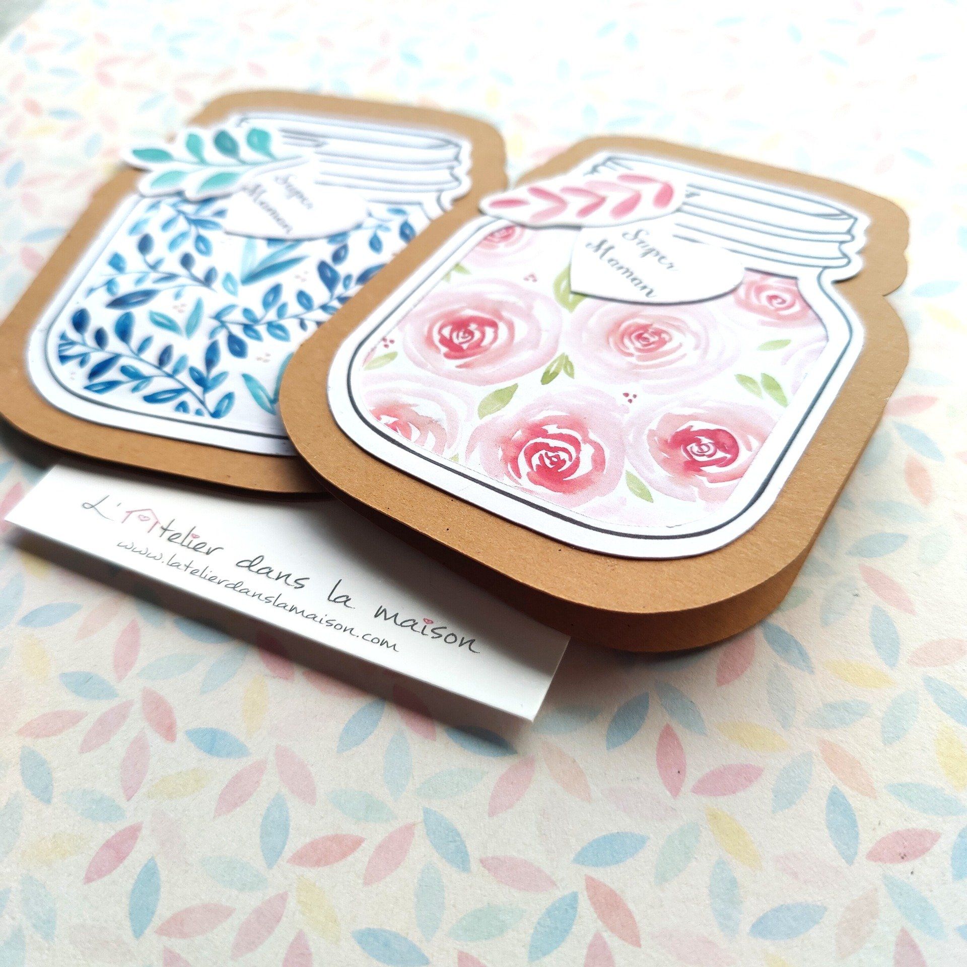 On retrouve le plaisir des cartes avec ces jolis bocaux remplis de fleurs et de feuillages. Ces cartes sont agrémentées d'un petit coeur portant l'inscription Super Maman.