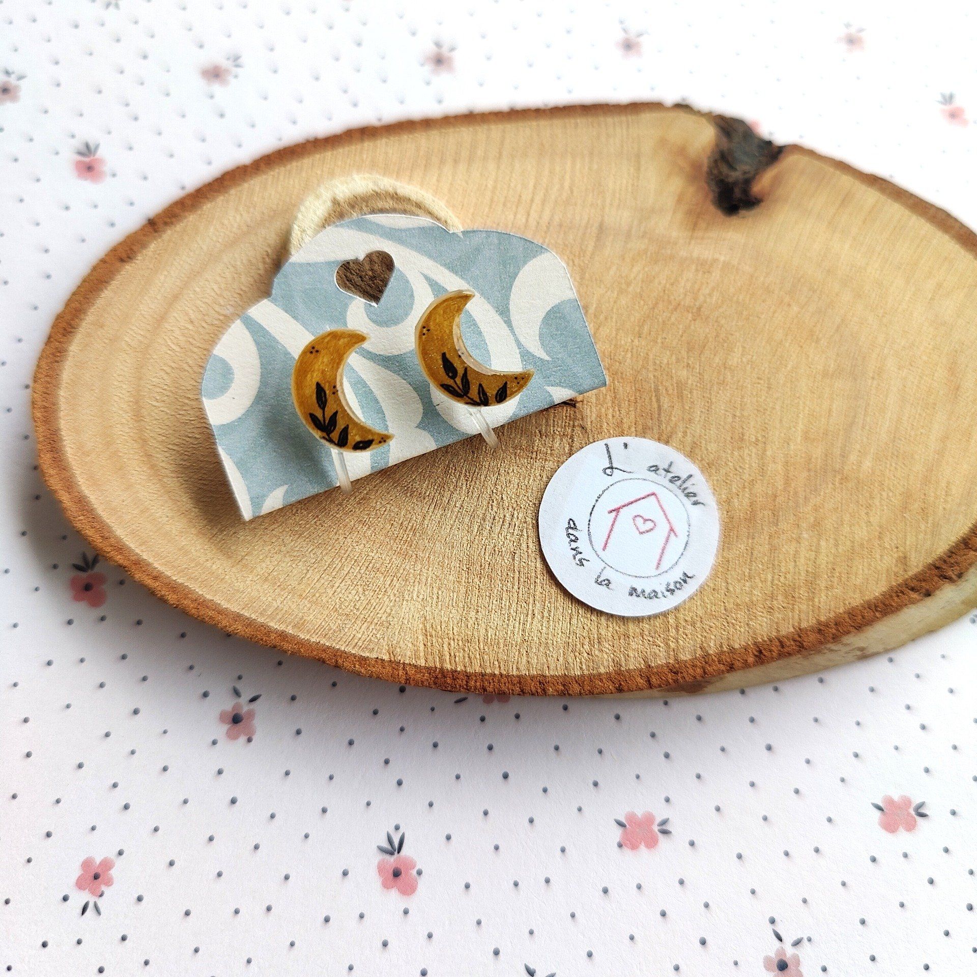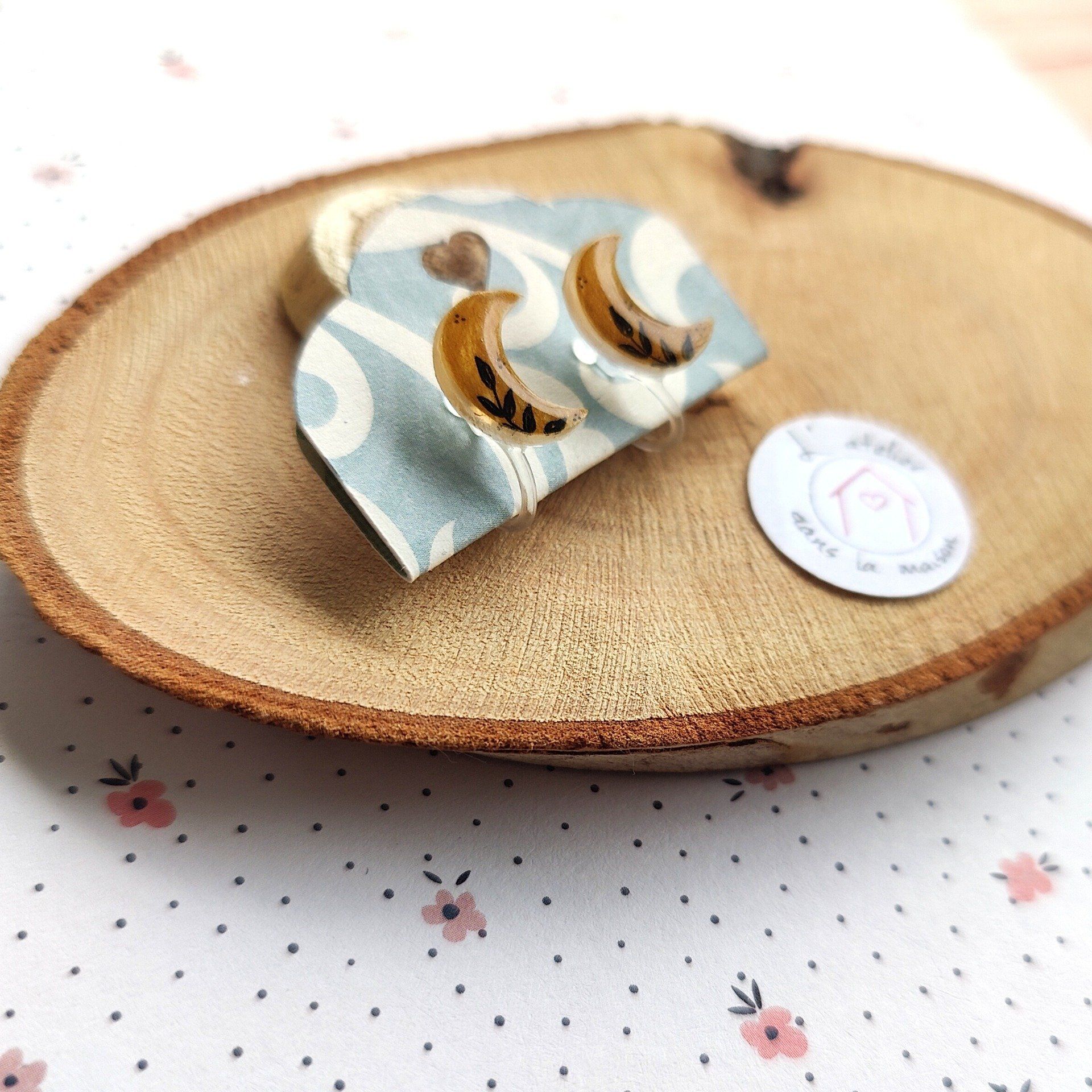 Ces puces d'oreilles clips faciles à mettre sont en forme de lune dans les tons dorés décorées de feuilles dessinées par mes soins.