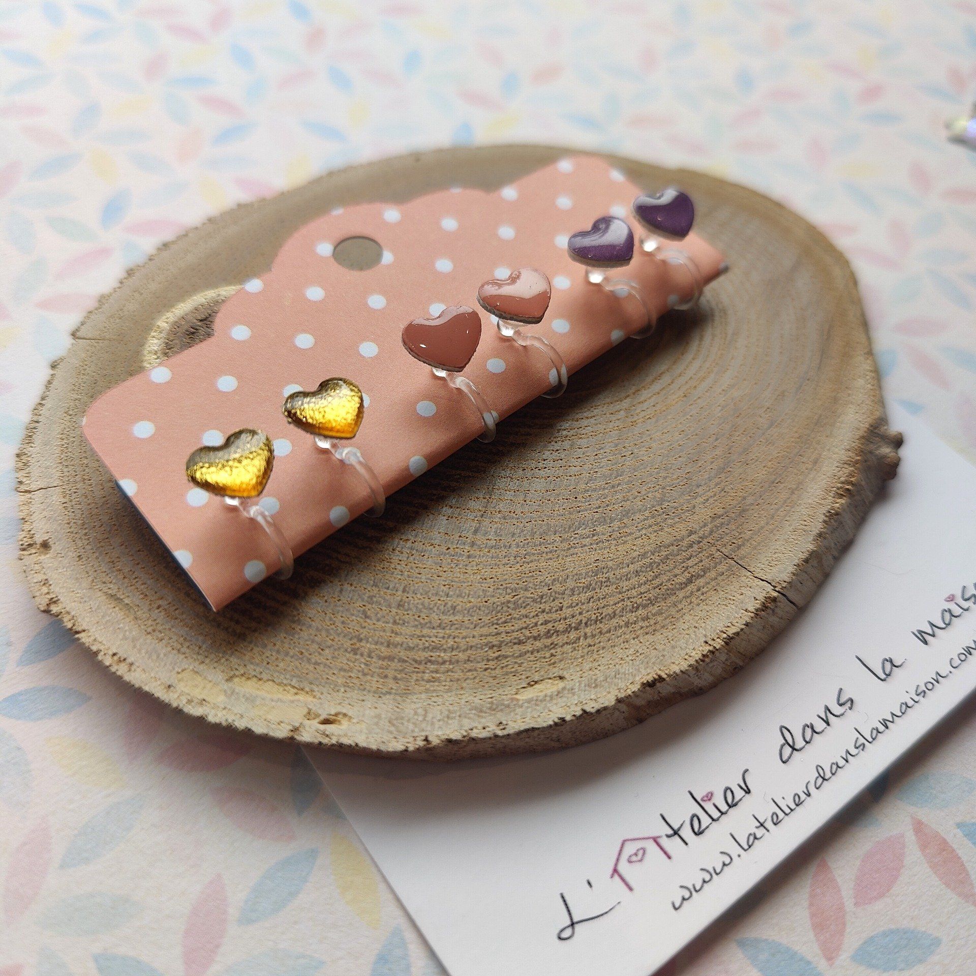 Ces petites puces d'oreilles clips faciles à mettre sont disponibles en doré, saumon ou violet.